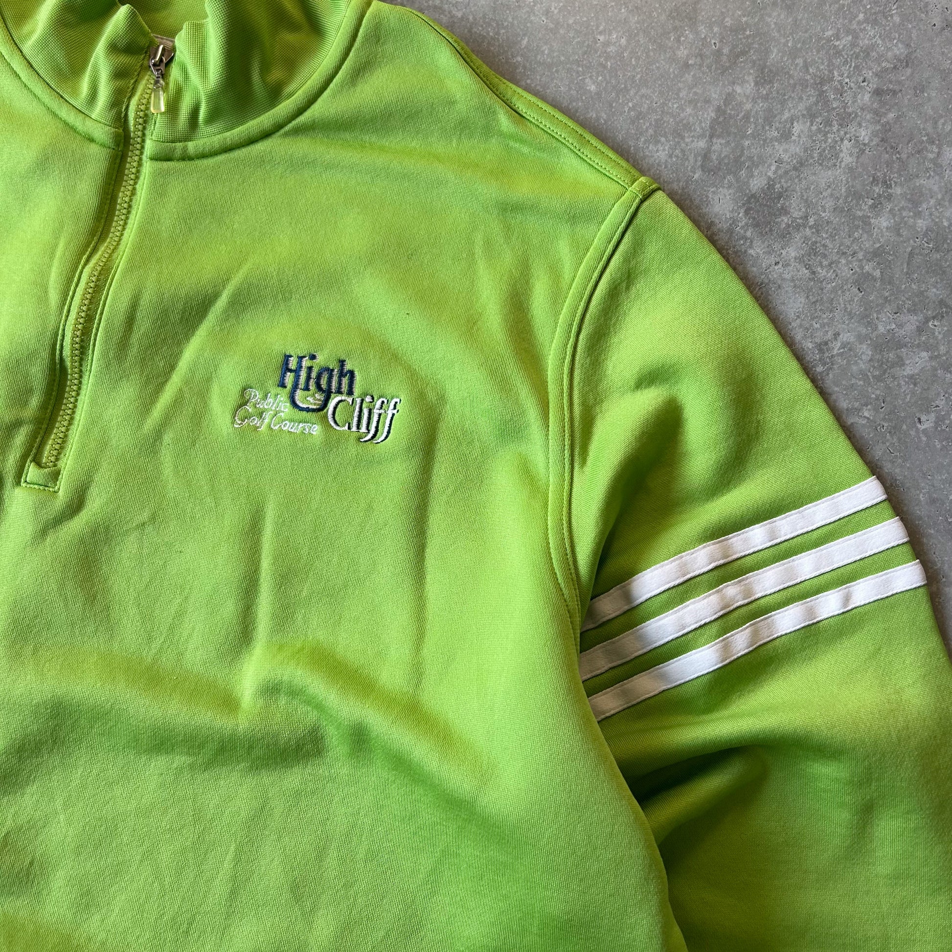 Elevate your activewear with this vibrant Adidas High Cliff pullover, featuring a striking lime green hue and classic quarter-zip design. Crafted from CLIMAKIT fabric, it ensures maximum comfort and breathability, ideal for those energetic outings. Styled with subtle striped detailing on the sleeves, this piece is both functional and fashionable, making it a versatile addition to any golfer's wardrobe.