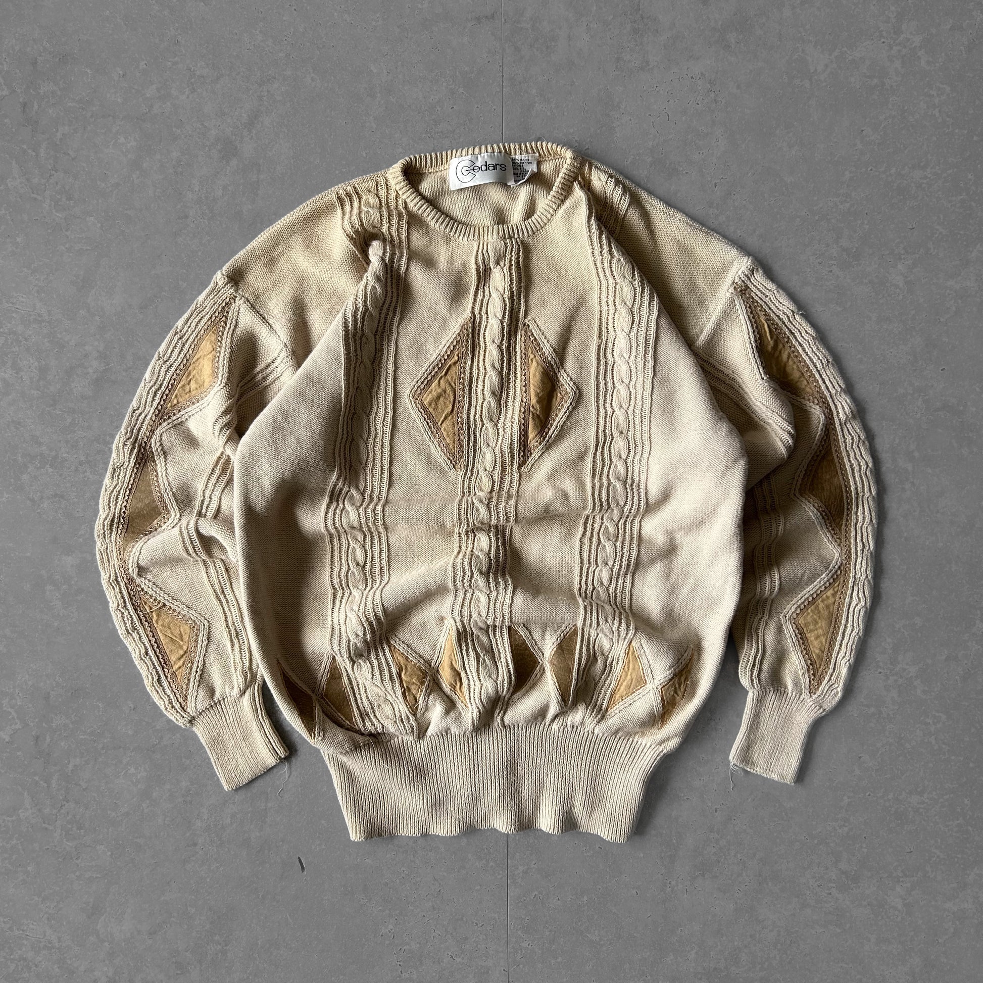 Beige cable-knit jumper with diamond patch panels and tan leather accents. Ramie–cotton blend with ribbed crew neck, cuffs and hem. Retro geometric knit details and leather patches give a vintage, textured look. Good vintage condition.