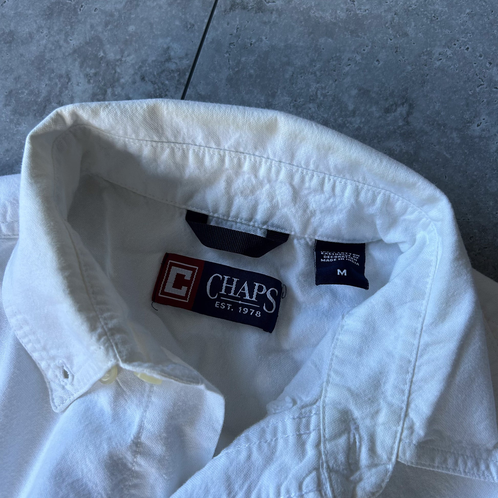 Classic white cotton button-down shirt by CHAPS. Made in India, 100% cotton with a button-down collar and chest pocket featuring subtle embroidered logo. Clean, lightly worn condition with crisp fabric—great for smart-casual or relaxed weekend looks. Size M, men's fit.