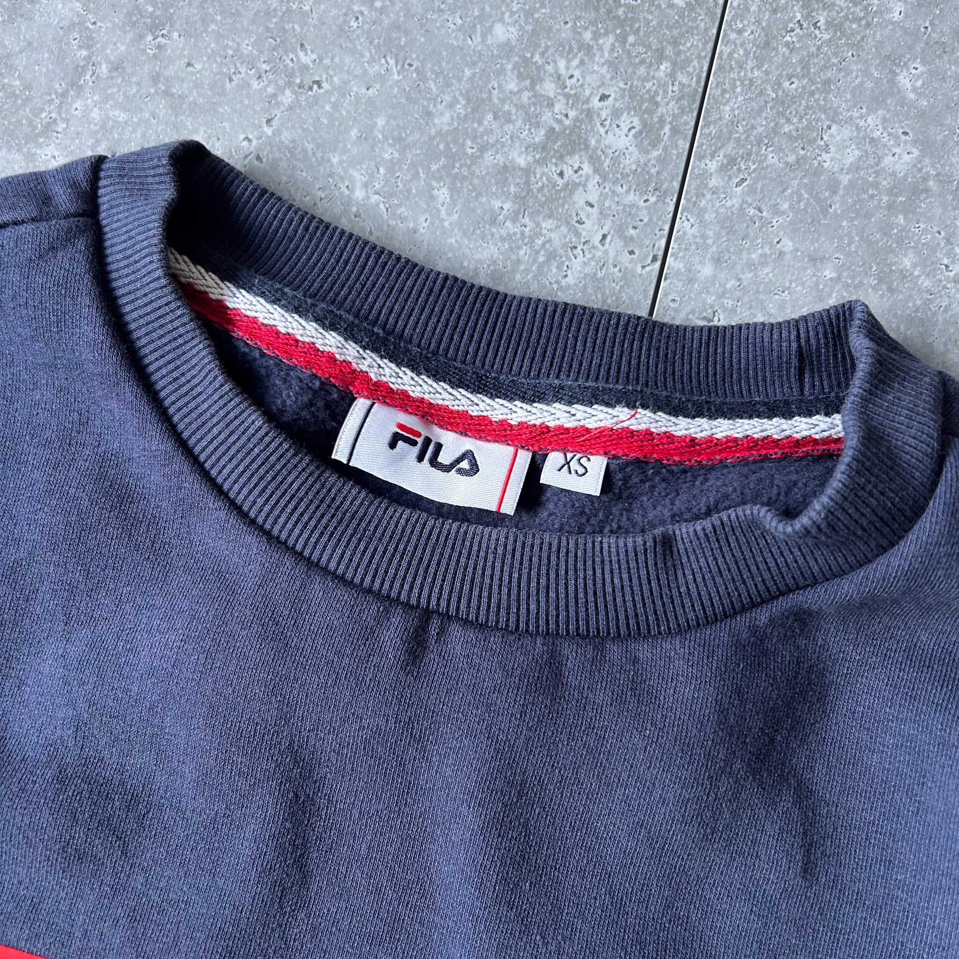 This stylish navy Fila sweatshirt features a prominent graphic logo on the front, embodying a retro vibe that's perfect for a casual day out or a cozy night in. Crafted from a soft cotton-blend fabric, it offers comfort and durability. The classic crew neck and ribbed cuffs add to its cozy charm, making it a staple for layering or wearing on its own. Perfect for layering over tees or pairing with joggers for a relaxed look.