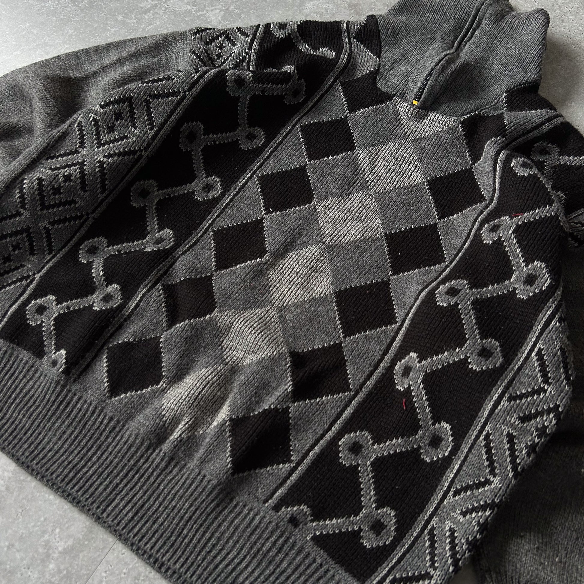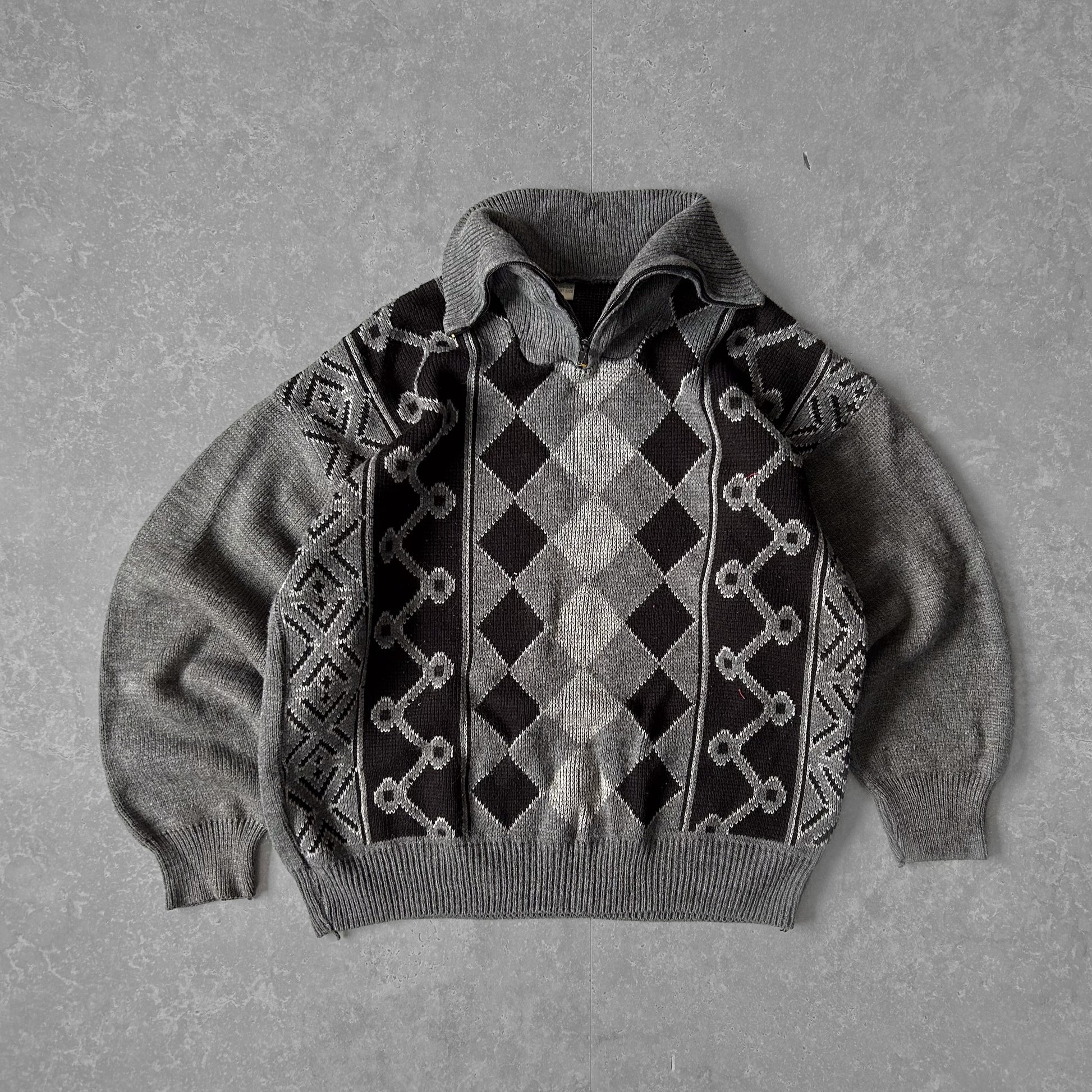 Women’s grey knit cardigan with a hood and bold argyle diamond panel. Wool-blend fabric with geometric side panels, ribbed cuffs and hem for a snug fit. Label reads Fille Unique – Standard Size; size tag not visible, fallback size L. Gently used, good vintage condition; ideal for casual layered looks.