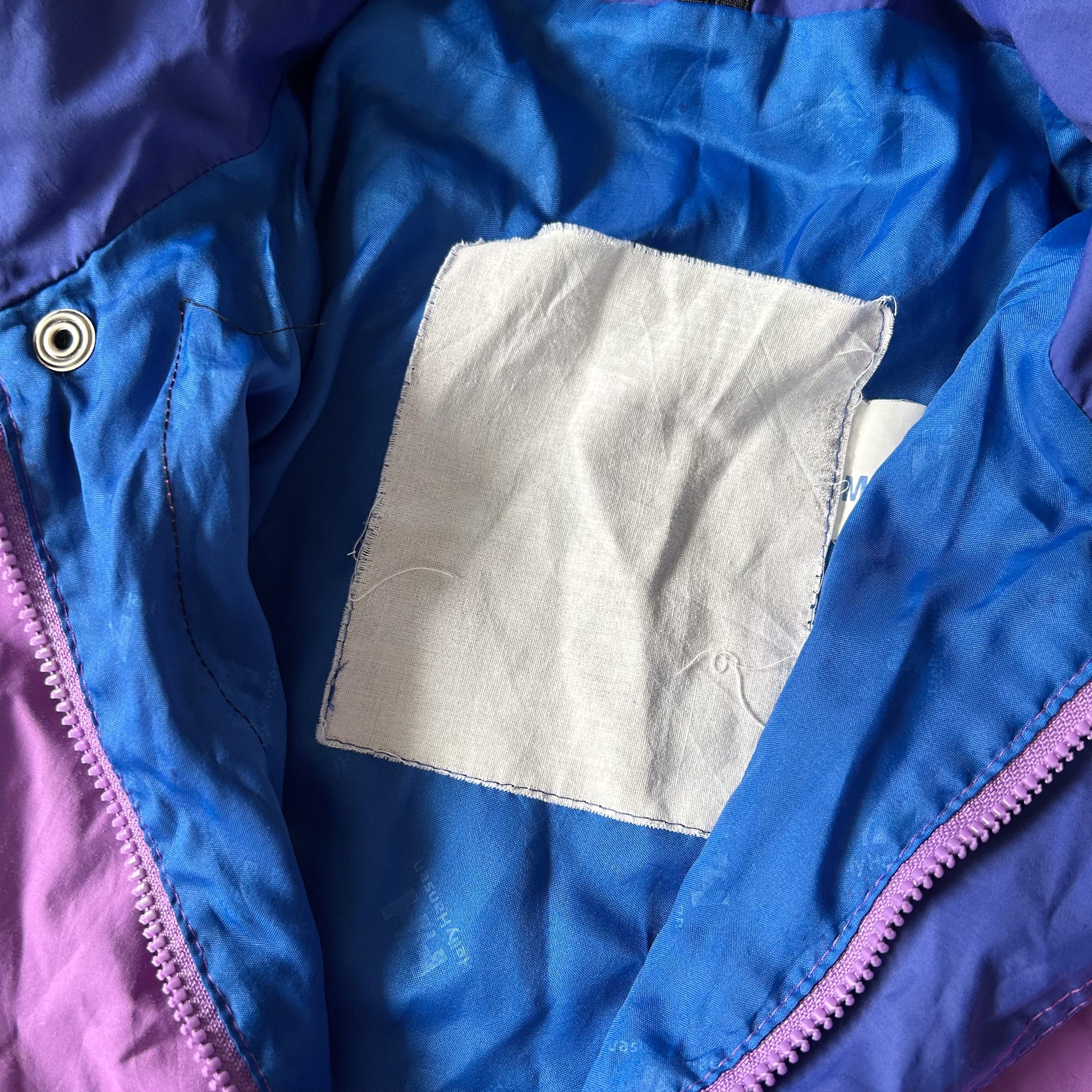 Bright vintage Helly Hansen windbreaker in purple with blue panels. Lightweight nylon shell with front zip and snap closure, two blue-trimmed flap pockets, and a blue interior lining. Hood with blue lining, pulls and drawcords intact. Light wear to fabric consistent with age. Bold retro outer layer suitable for casual outdoor wear.