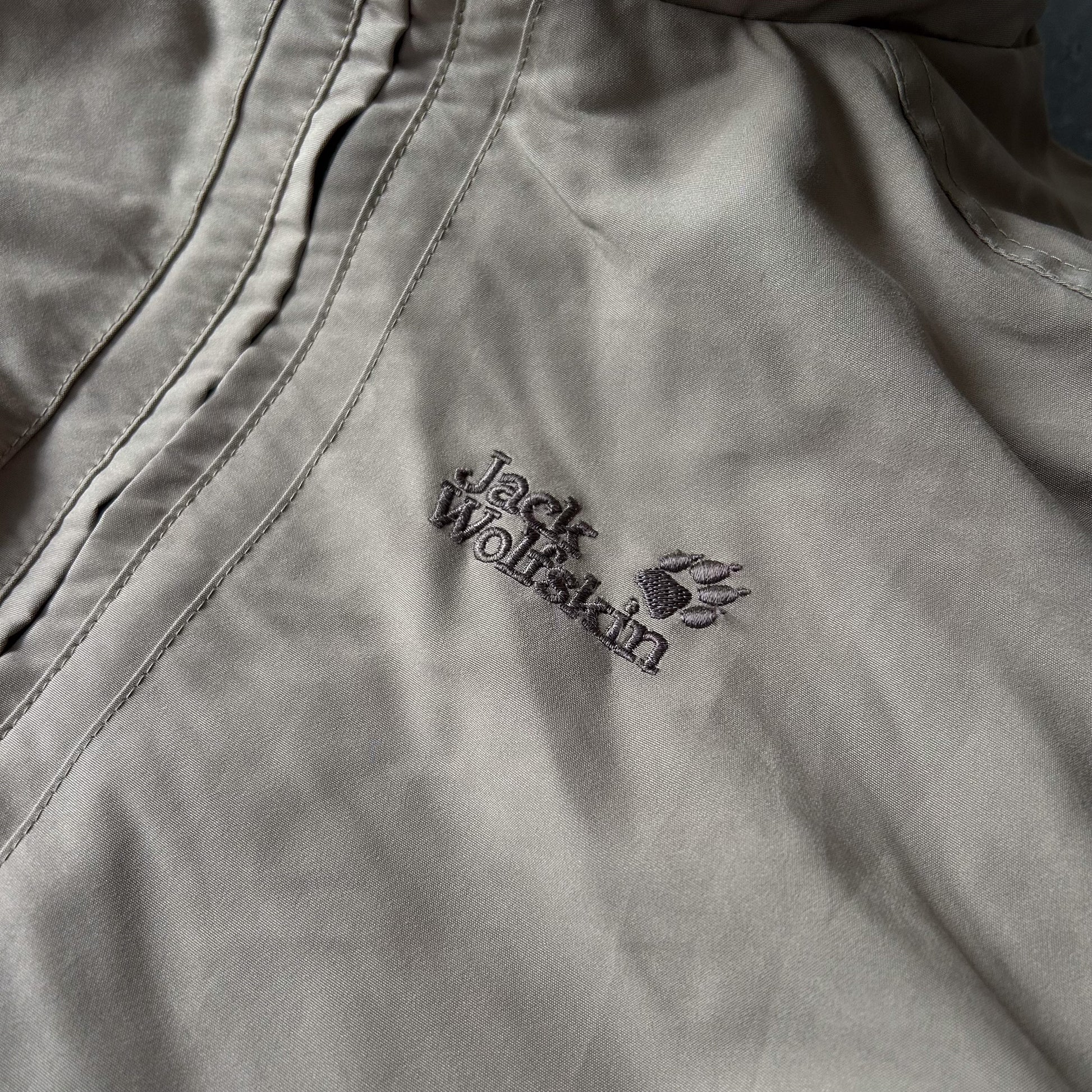 Beige Jack Wolfskin Urban Outdoor lightweight windbreaker for women. Stand collar, full-length zip with a protective placket, and two large front patch pockets with flaps. Subtle chest logo embroidery adds a classic outdoor finish. Versatile, everyday outer layer suitable for city walks and light outdoor activity. UK size 12; made in Thailand.