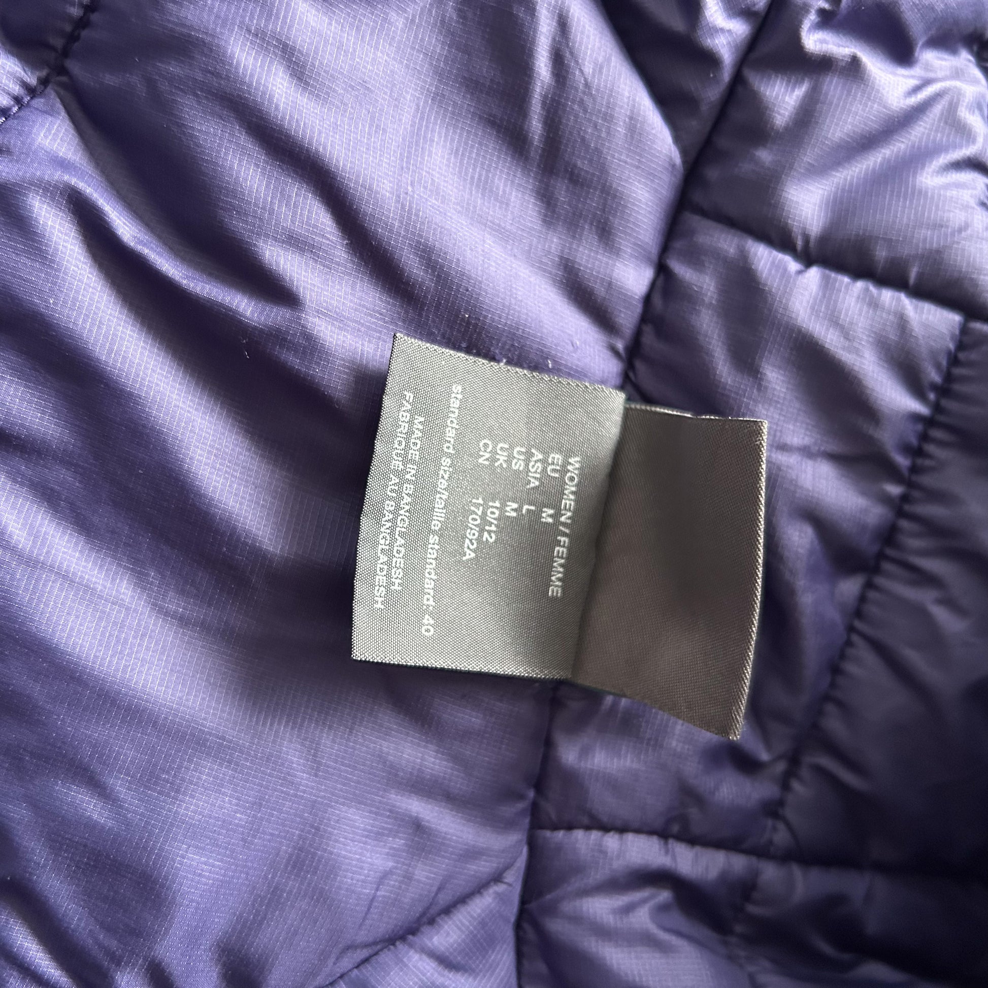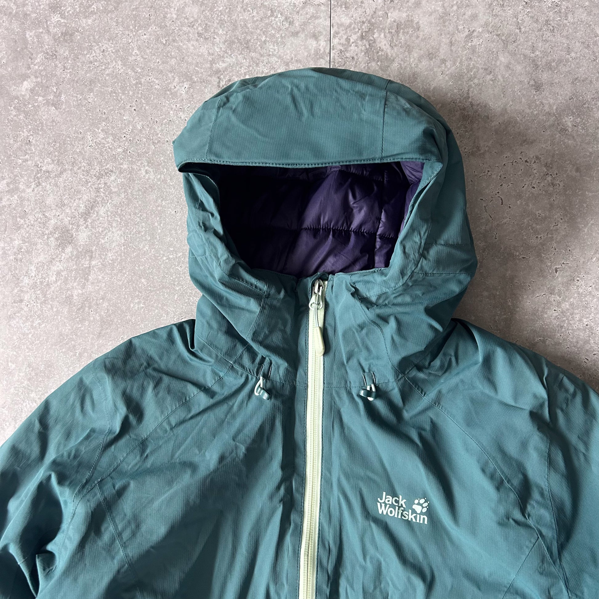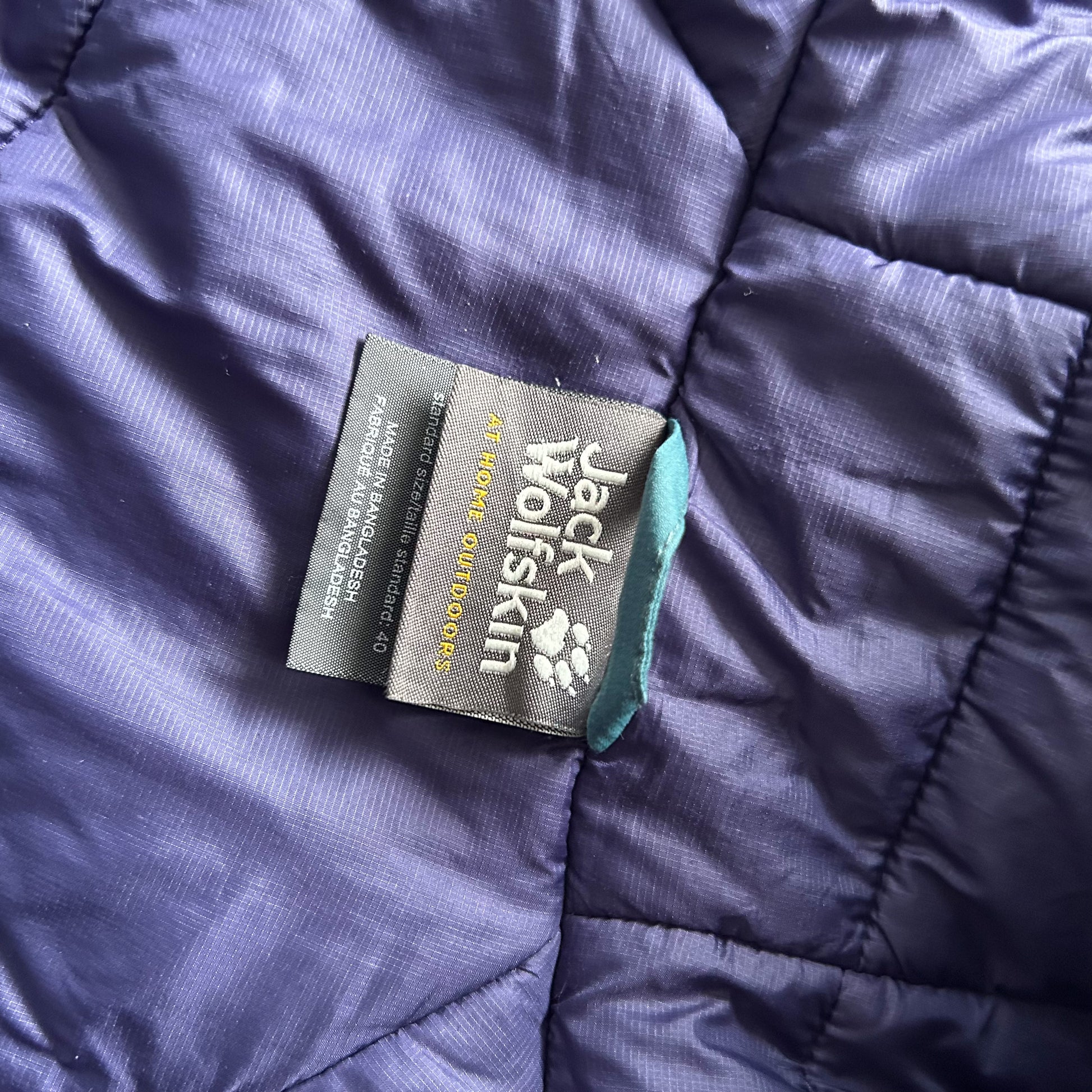 Teal quilted padded jacket for women by Jack Wolfskin. Hooded, front zip with light cream zipper, two hand pockets and purple inner lining. Lightweight, wind/water-resistant shell with synthetic insulation for warmth; versatile outdoor layering piece.