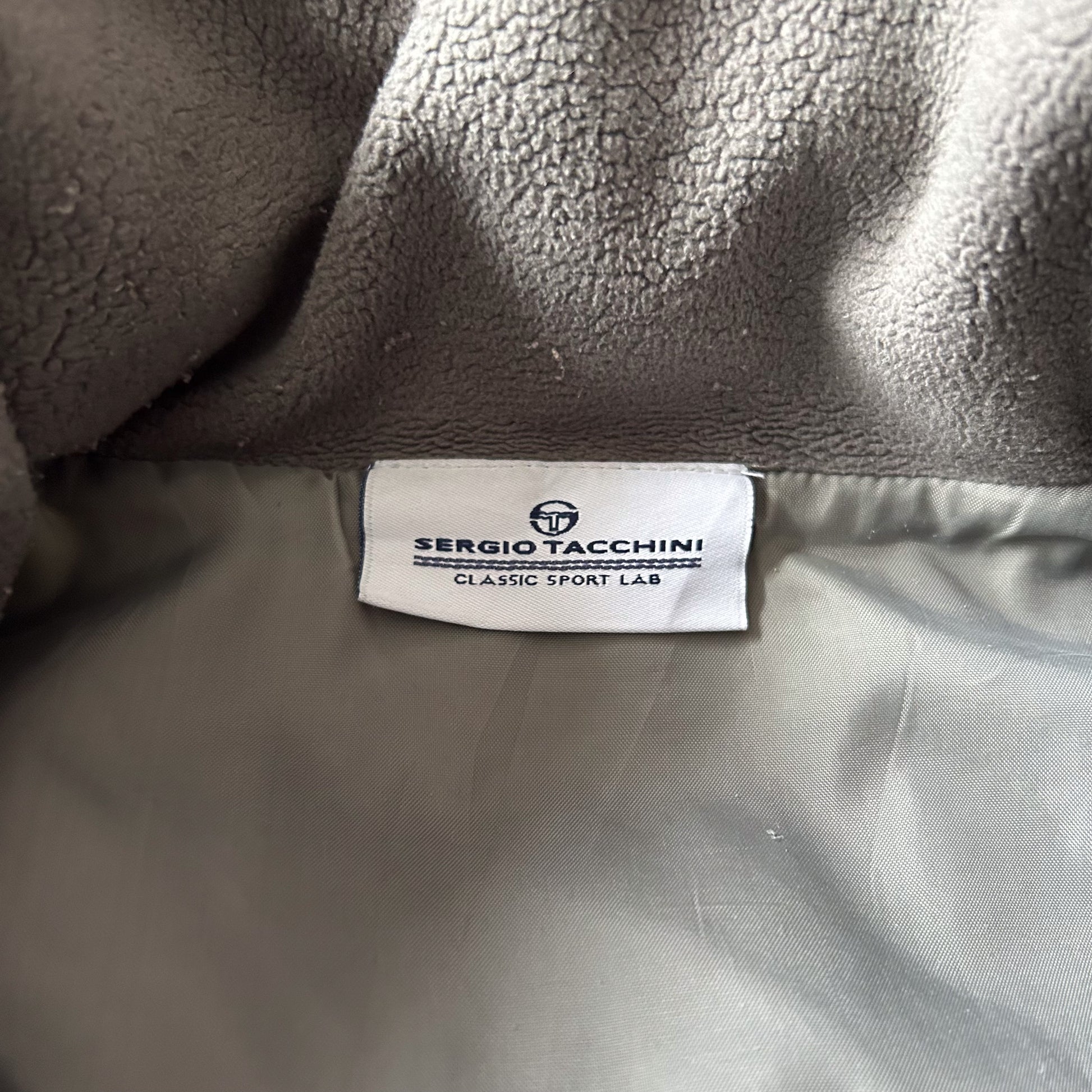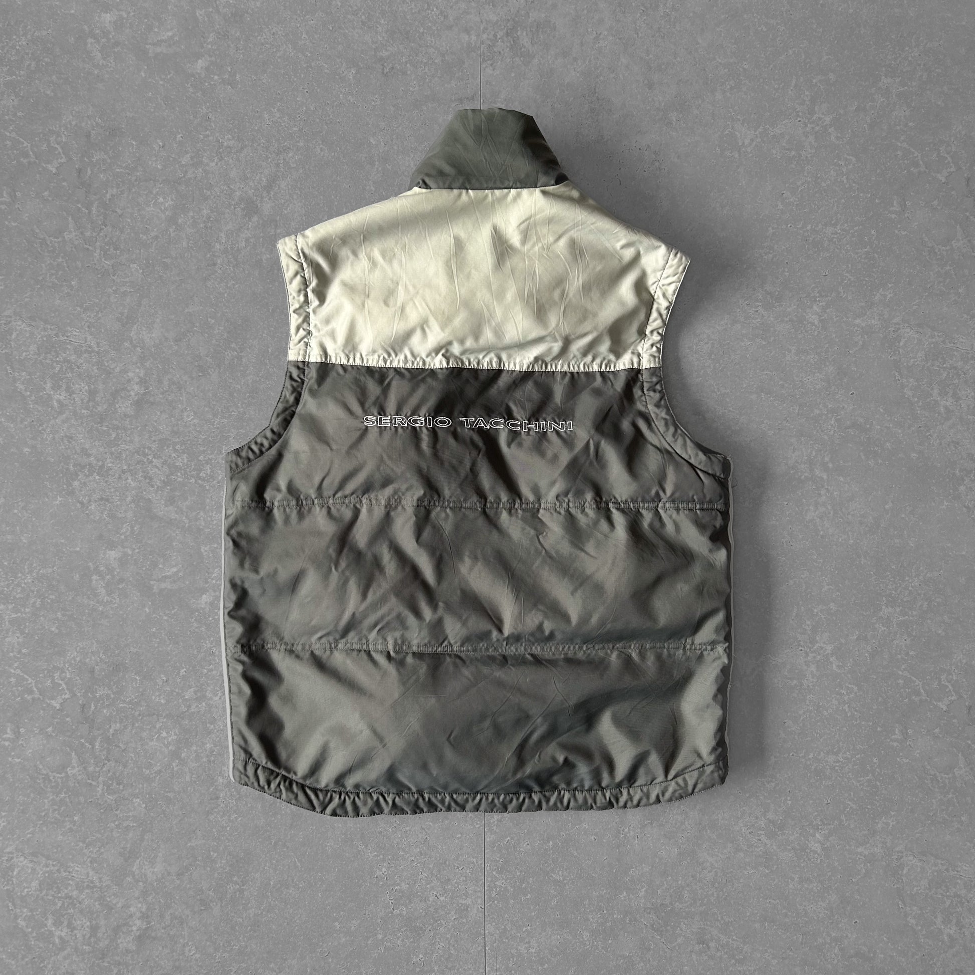 Elevate your activewear collection with this stylish Sergio Tacchini puffer vest. Featuring a contemporary color block design in earthy tones of dark green and beige, this vest is perfect for layering during outdoor activities. The lightweight, padded construction offers warmth without the bulk, while the zippered pockets provide functionality. Ideal for casual outings or sports, this vest combines comfort with a sporty aesthetic.