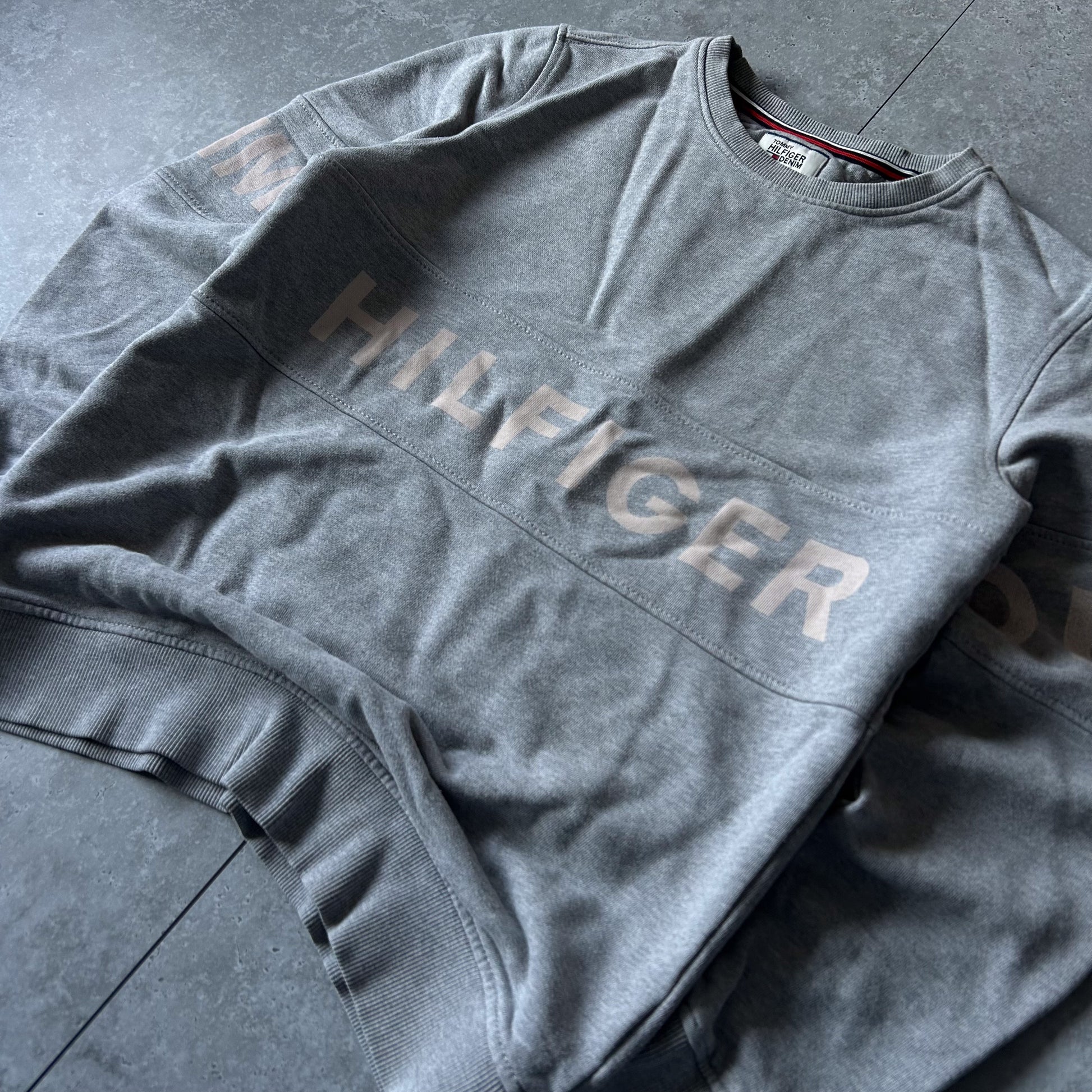 Elevate your casual style with this Tommy Hilfiger Denim sweatshirt. Featuring a soft grey fabric, this comfortable piece showcases bold branding across the front sleeves. Its classic fit and crew neck design ensure a relaxed silhouette, perfect for layering or wearing on its own for a laid-back look. Ideal for everyday wear, this sweatshirt combines style and comfort effortlessly.