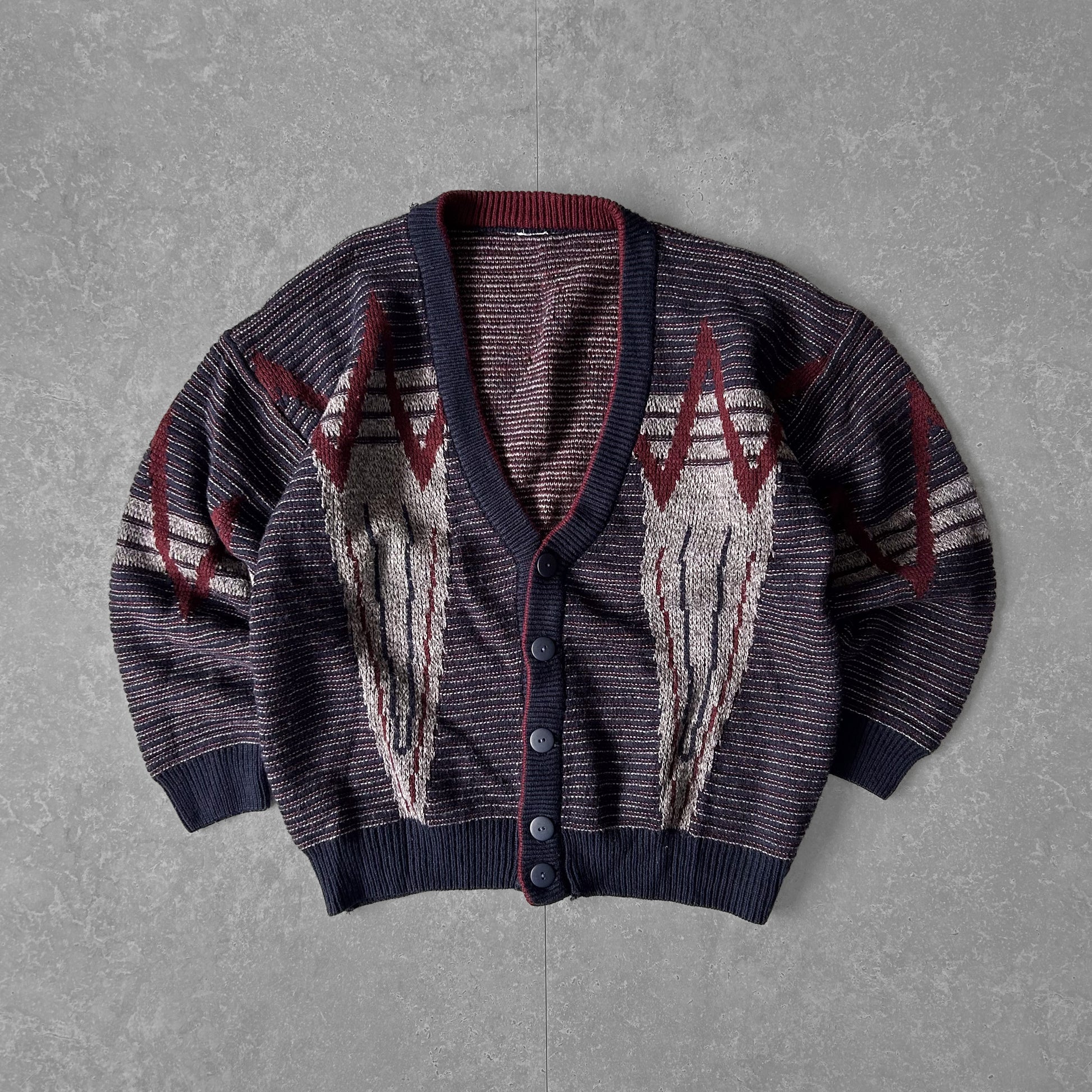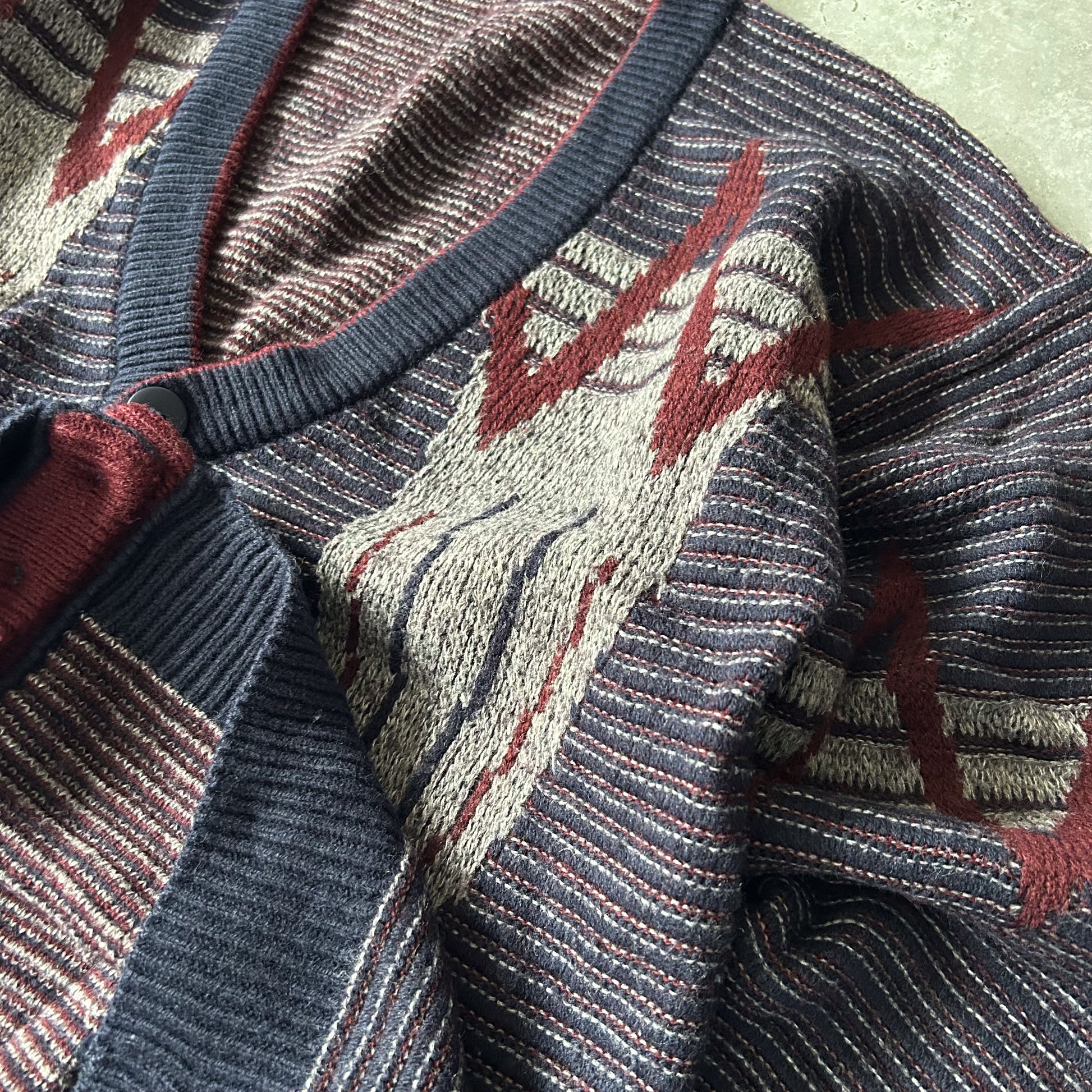 Chunky button-front cardigan with a navy base and bold cream panels featuring burgundy diamond/zigzag motifs. Thick knit with ribbed cuffs and hem, and a deep V-neck. A retro, 1980s-inspired piece with a rugged, textured finish; in good vintage condition.
