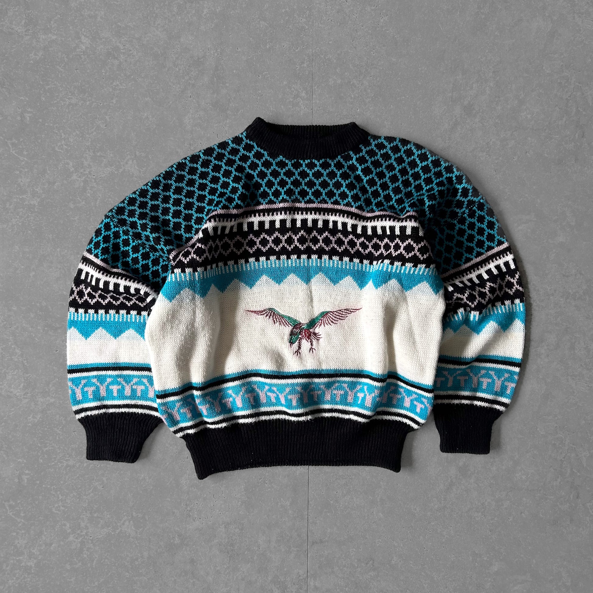 This striking vintage-inspired knitted sweater features a bold geometric pattern and a vibrant turquoise and black color palette. The centerpiece is a beautifully embroidered eagle, showcasing intricate detailing. Ideal for layering, this pullover has a classic fit with a snug crew neck and ribbed cuffs, making it perfect for both casual outings and cozy nights in.