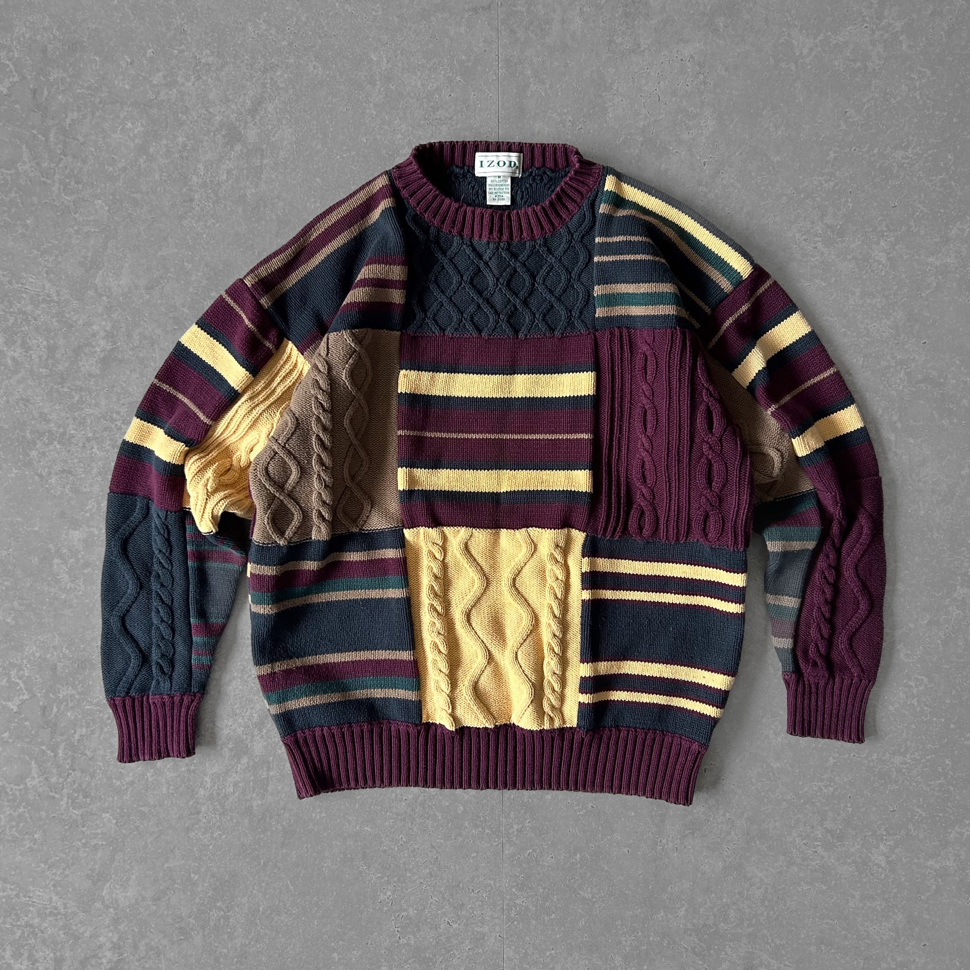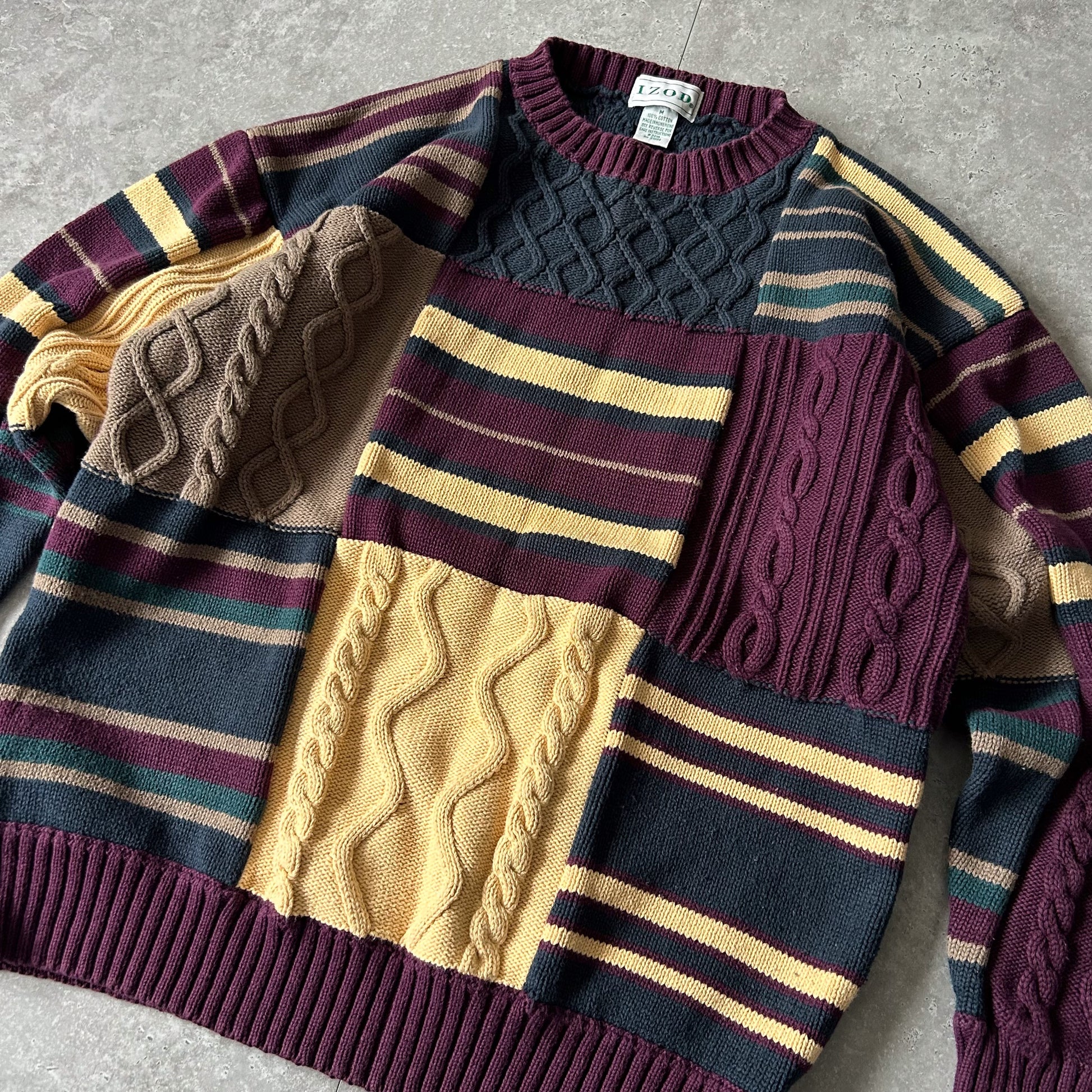 Step into retro style with this eye-catching IZOD patchwork sweater. Featuring a unique blend of colors and textures, this sweater showcases a mix of rich burgundy, navy, and mustard hues alongside intricate cable knit designs. Crafted from 100% cotton, it ensures both comfort and warmth. Perfect for layering or making a statement on its own, this piece is a timeless addition to any wardrobe.