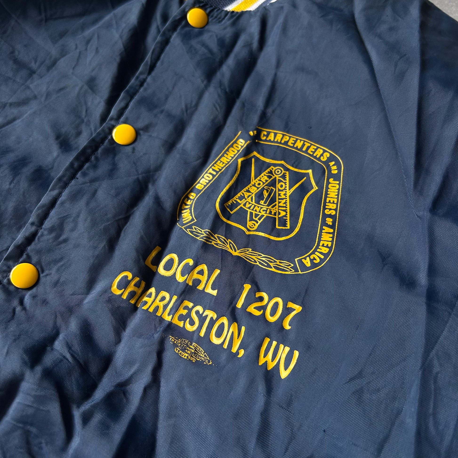 This retro-inspired bomber jacket by West Wind combines style and comfort. Featuring a rich navy color with vibrant yellow trim and button details, it showcases a distinguished embroidered insignia for Local 1207. The quilted interior provides warmth while maintaining a lightweight feel, perfect for layering. A great addition to any vintage clothing collection or casual outfit.